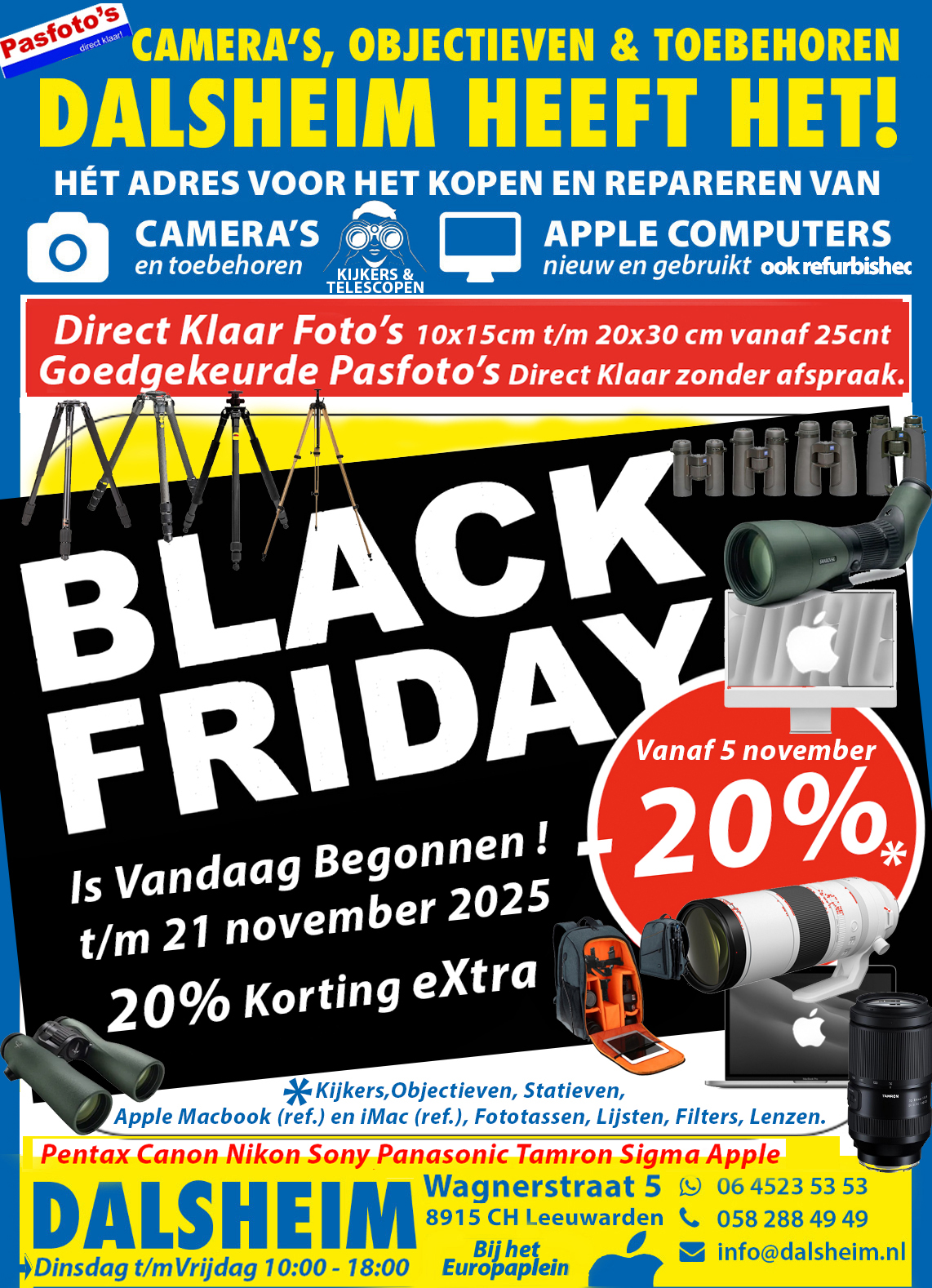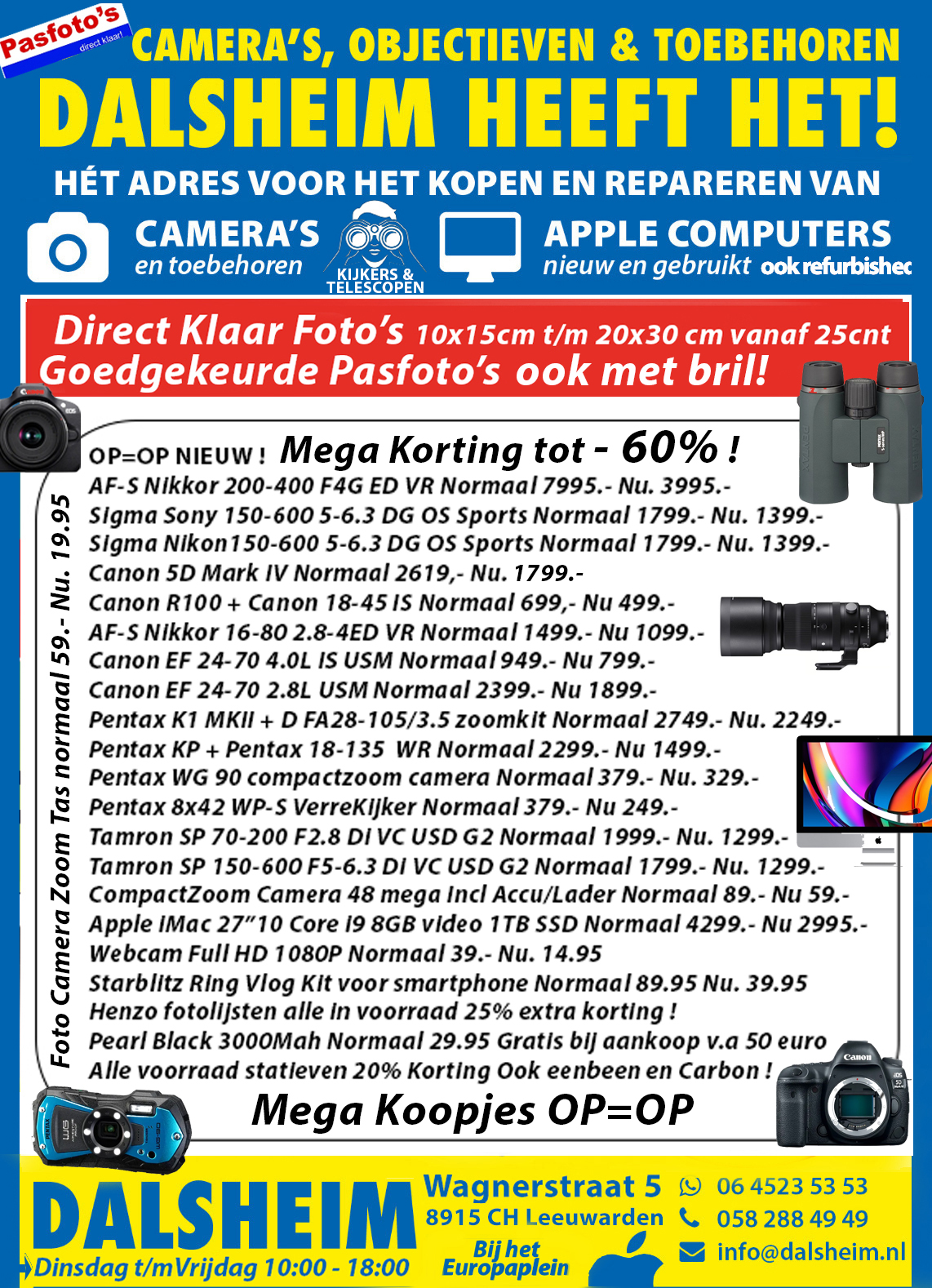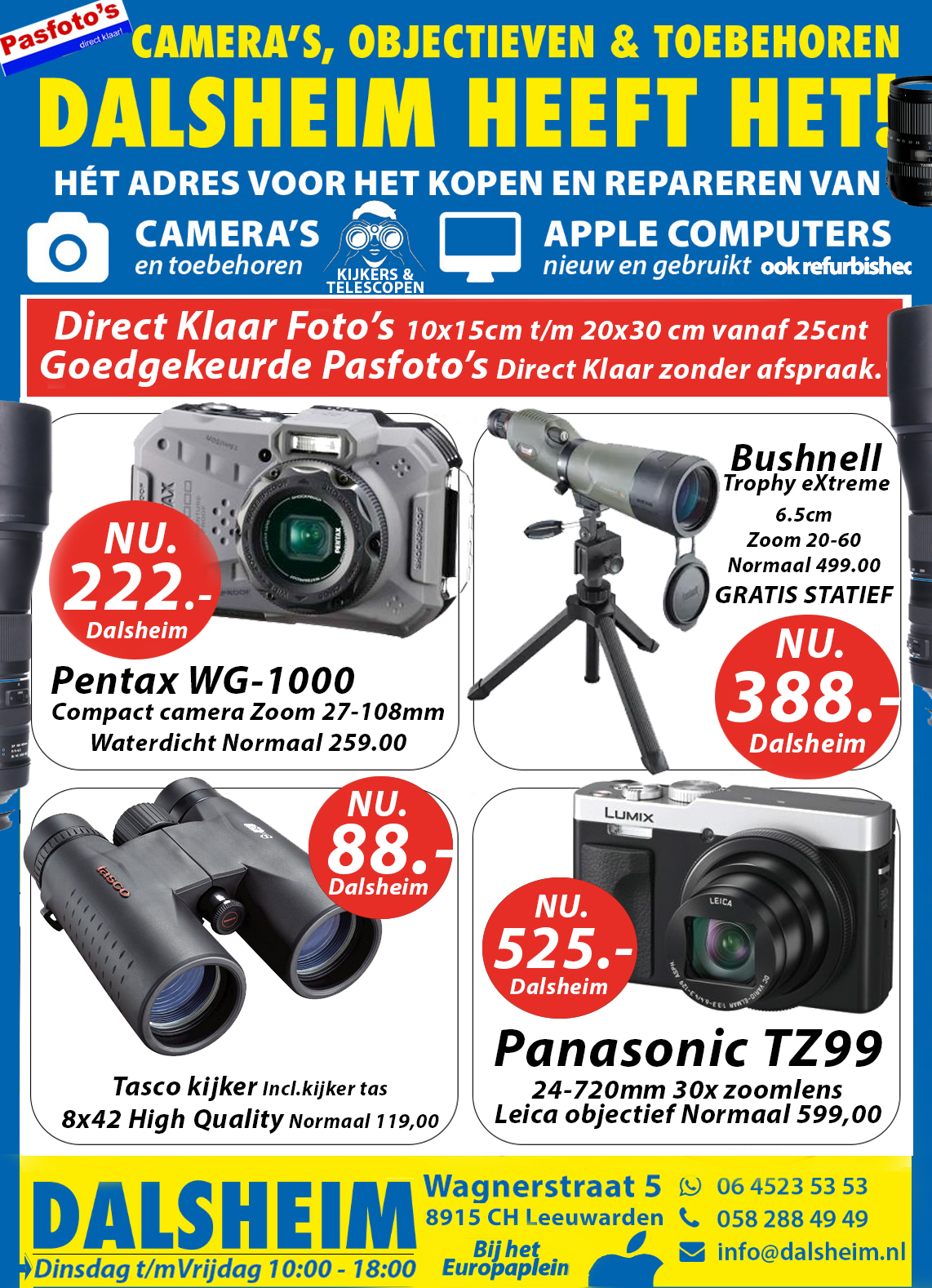 Spiegelreflex, objectieven, compact camera’s, flitsers, statieven, fotolijsten, fotoalbums, geheugenkaarten, fotorolletjes en andere toebehoren NIEUW en gebruikt.